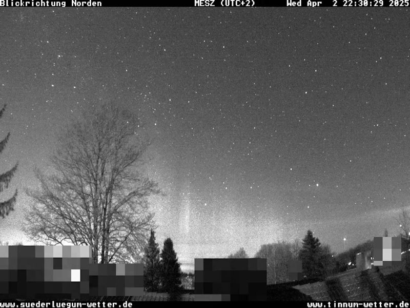 Kommentar:Das erste Mal am 12.10.2021 von 22 Uhr - 22.30 MESZ (20 Uhr - 20.30 UTC),nur wenig über dem Horizont,vielleicht 10 °,dafür deutlich Bewegung drin; das zweite Mal am 13.10.2021 von 0.10 Uhr - etwa 0.30 MESZ (12.10.2021 22.10 - 22.30 Uhr UTC) mit einem deutlichen Beamer Richtung NW links vom Baum,leider schnell im Hintergrund verblassend.Vielleicht ging das Polarlicht auch bis 01 Uhr MESZ,dafür war die Auflösung der Webcam zu schlecht.