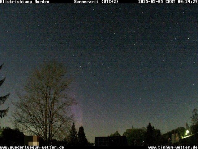 Kommentar:Auch die private Wetterstation Süderlügum (54 °52´ 19 " N/8° 54´ 45" O) hat letzte Nacht,in der Zeit von 3 Uhr bis 3.20 Uhr, wieder Polarlichter mit der Webcam aufgezeichnet. Leider überstahlte die rasch einsetzende Dämmerung die Szene.