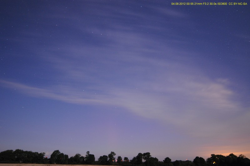 Kommentar:Gegen 20:05Uhr bis 20:10Uhr konnte man das PL als schwachen gräulichen Schimmer visuell sehen, besonders an der Kante neben der Baumgruppe genau in Nordrichtung. (also schwach visuell)